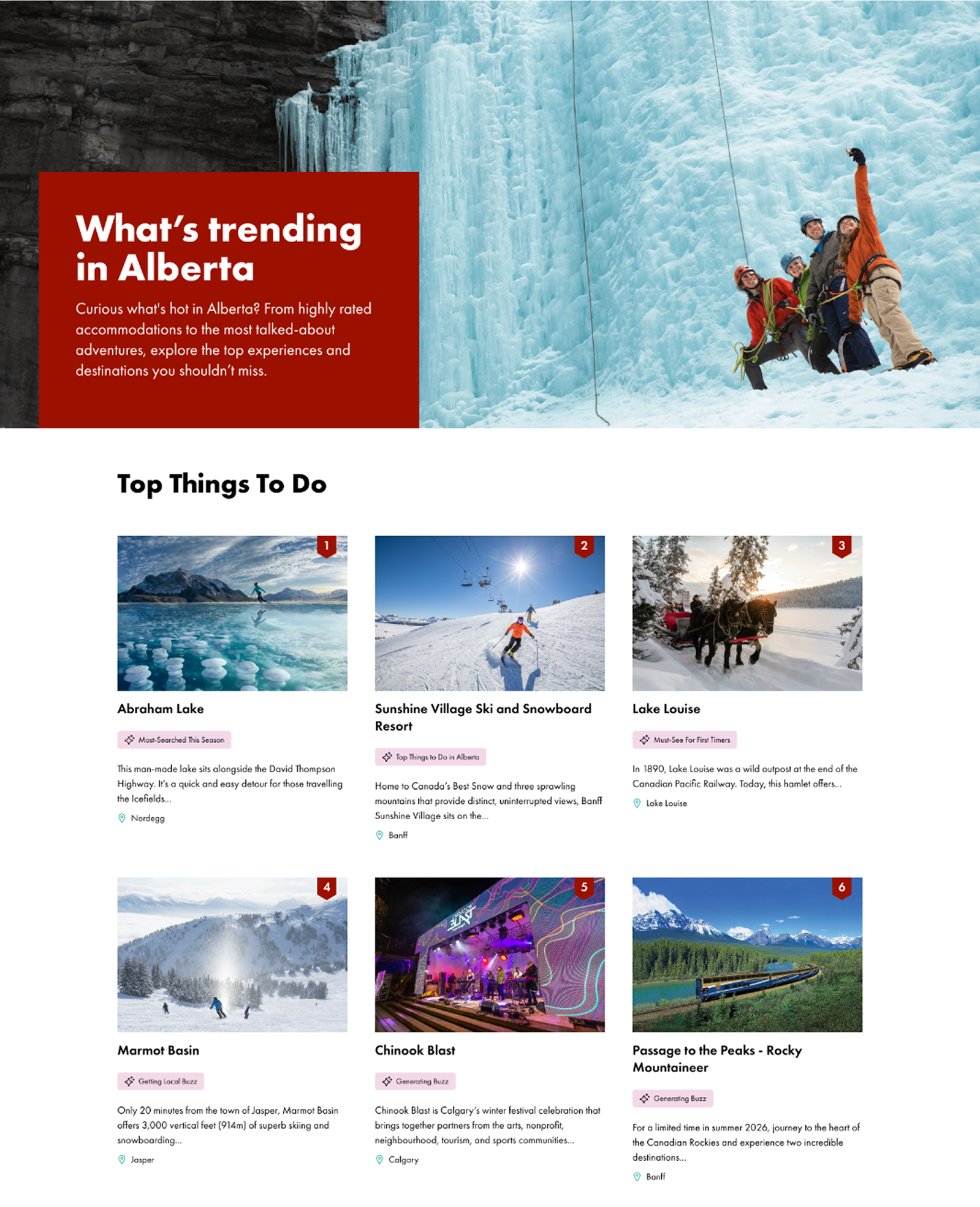 The experience builds on previous traveller interest in learning What's Trending. It uses AI analysis of website analytics, social sentiment, and more to generate a list of trending experiences from Travel Alberta's internal database of tourism operators called ATIS.