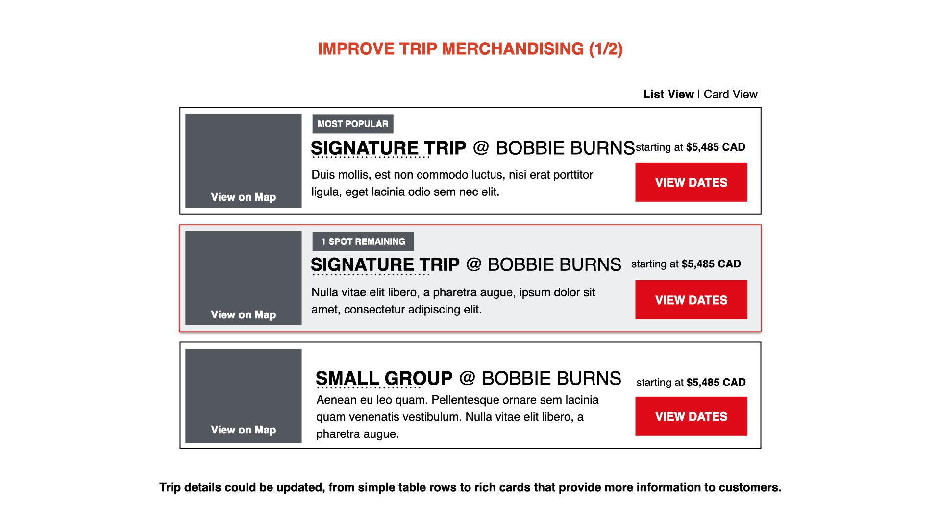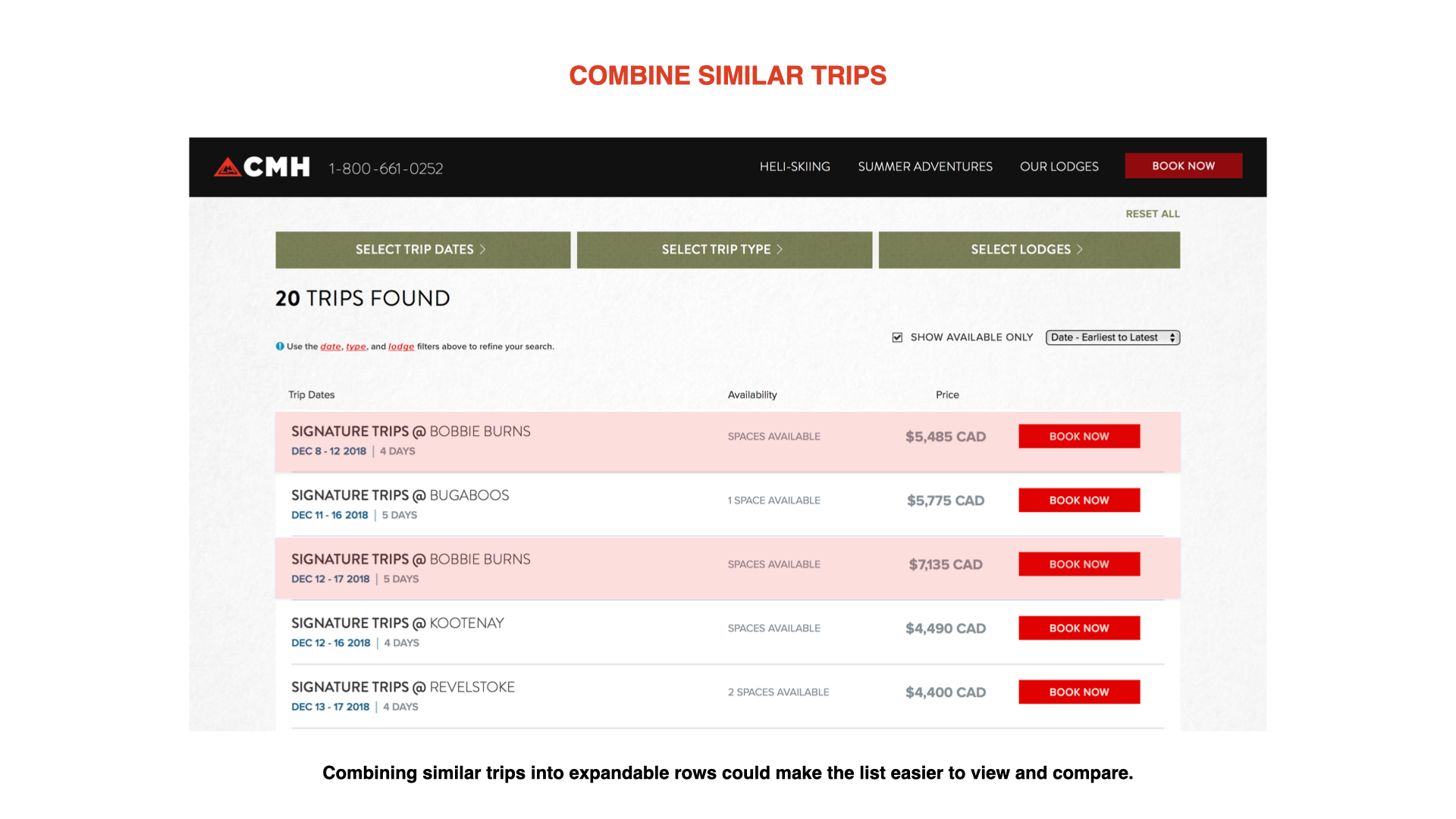 The "trip grid" — the #1 most visited page on CMH's website — wasn't effectively converting potential customers. The page featured a sprawling table with hundreds of bookable trips, and was causing decision paralysis. Although customers were visiting the page, they weren't taking the next step to purchase.
