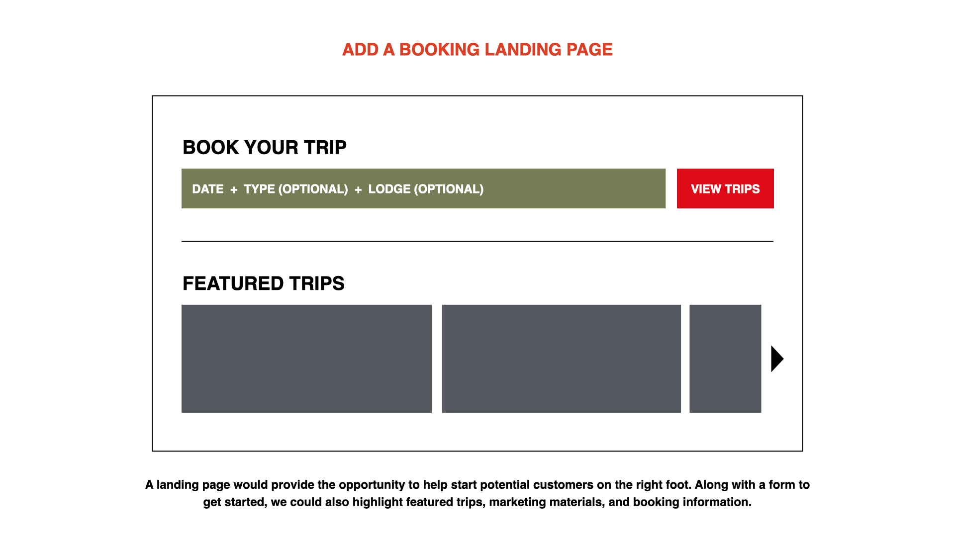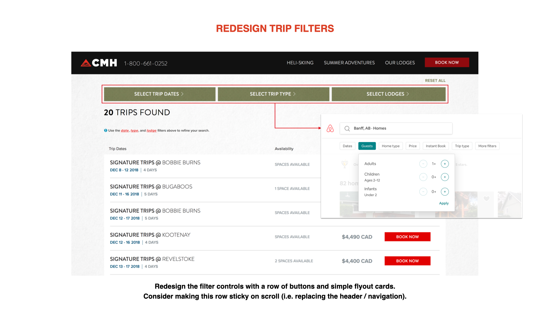 Booking a heli-skiing trip shouldn't feel like a budget version of Excel, it should feel reflect the prestige experience CMH is offering, reflecting the modern booking-focused travel sites customers are used to, such as Expedia and Airbnb.